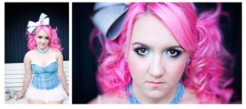 “I prelightened her Level 6 hair to a degree 10 pale blonde,” she says. “Then, on damp dryed hair, I applied Paul Mitchell Inkworks Hot Pink, Clear and conditioner (to dilute it a little), plus a drop of Neon Red and Purple. Then, she sat under a dryer with out a cap and we rinsed in cool water.”