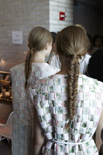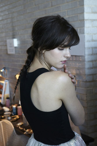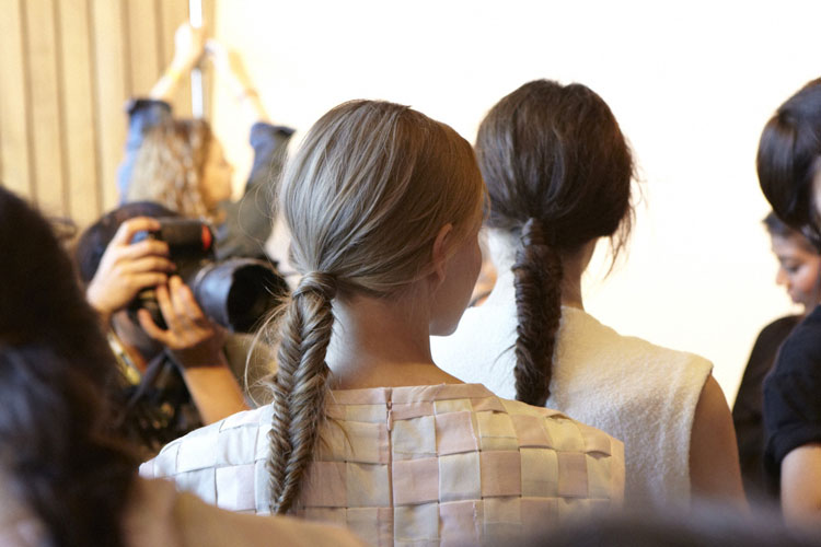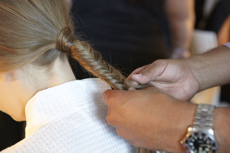 To create the braids, on damp hair, Polko applied a cocktail of L’Oréal Professionnel Mousse Volupté and L’Oréal Professionnel Volumetry Root Spray from roots to ends. Hair was then rough dried with a blow dryer for volume and texture on the crown. After center parting strands and applying L’Oréal Professionnel True Grip everywhere hair to produce weightless volume and grip, a low ponytail was secured with an elastic on the nape of the neck. After teasing hair with fingers on the crown, each ponytail was styled right into a classic or fishtail braid. To complete, Polko pulled out pieces from the braids gently to create a roughed-up, lived-in feel. For a last touch the braids were finished off with L’Oréal Professionnel Infinium 3 Hairspray.