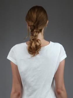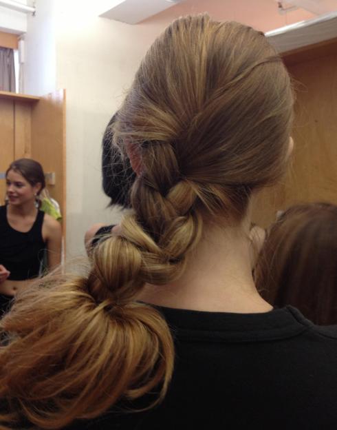 Doreen Guarneri for pure NV BKT complemented the airy wardrobe with hair that flowed effortlessly and contained a part to symbolize the pleat. Guarneri accomplished this with the bungee braid, a facet low pony that’s tousled at the ends. This offers structure with a romantic flirty feel, like the collection. It’s easy to create: